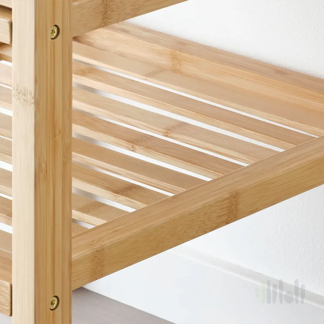 میز کنار تخت بامبو ایکیا NORDKISA دارای کشویی است که از هر دو طرفباز میشود – یعنی میتوانید آن را به دیوار بچسبانید یا در وسط اتاق قرار دهید و همچنان به راحتی به محتویات دسترسی داشته باشید. میز کنار تخت بامبو ایکیا NORDKISA دستگیرههای کشو طوری طراحی شده که کابلها را بدون شلختگی عبور دهید؛ مثلاً شارژر گوشی، هدفون یا حتی سیم لامپ را از آن رد کنید و اتاق مرتب بماند. دو قفسه باز در بالا و پایین، فضای اضافی برای نمایش وسایل دکوری، گلدان کوچک یا کتابهای مورد علاقه ایجاد میکند. پایههای محکم بامبو، استحکام بالایی دارند و وزن تا ۱۰-۱۵ کیلوگرم را به راحتی تحمل میکنند.